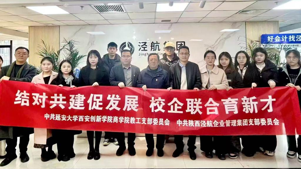 本网讯 为深入贯彻落实新时代党的建设总要求,创新工作形式,积极构建“资源共享、优势互补、协同创新、共同发展”的基层党建工作新格局,12月10日上午,商学院教工党支部与陕西泾航企业管理集团党支部联合开展校企党建共建活动。商学院院长兼教工党支部书记睢党臣、陕西泾航企业管理集团董事长辛波、校企双方党员代表及部分在企实习就业的优秀校友共同参加活动。活动由商学院党总支副书记冉亚周主持。