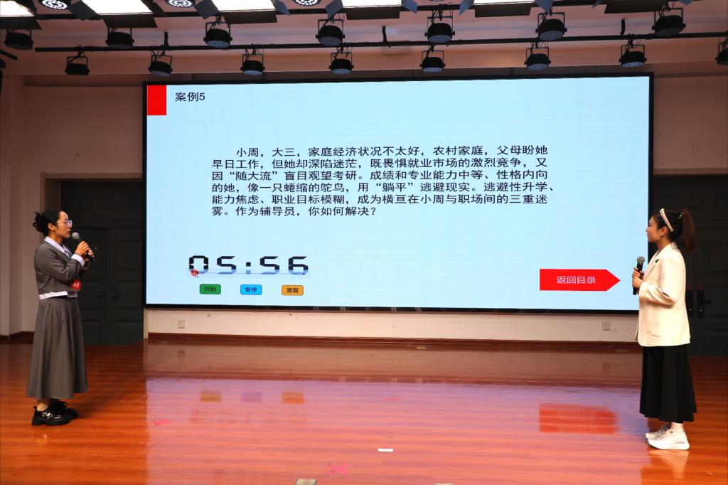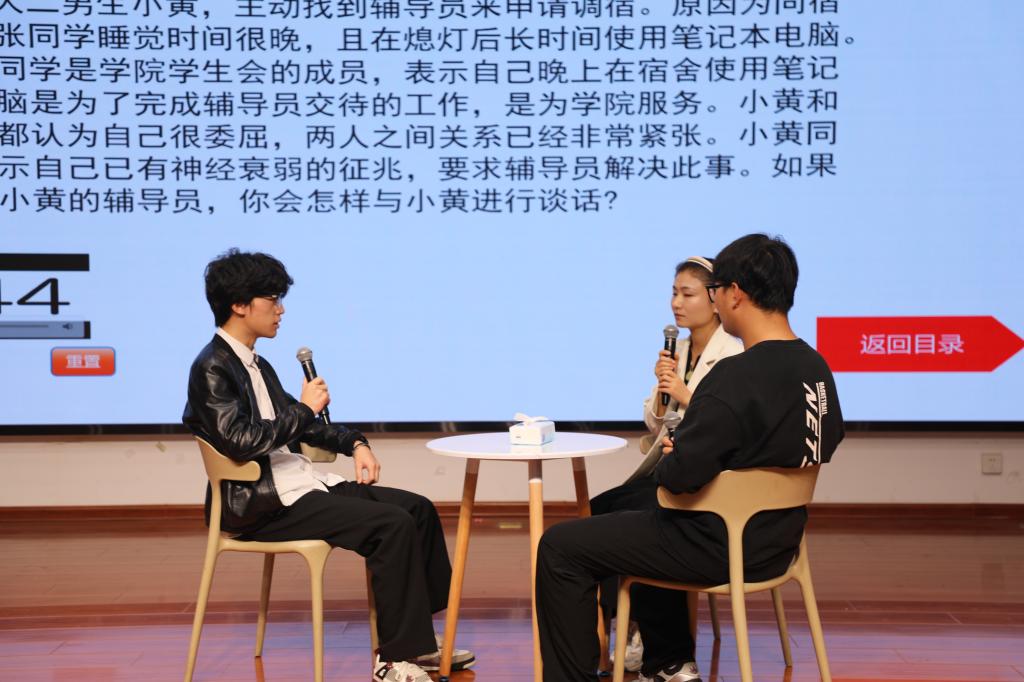 本届大赛7名辅导员历经初赛选拔脱颖而出,进入决赛。决赛设置特色工作展示、案例研讨、谈心谈话三个环节,全面考察了辅导员的政治理论水平、专业素养和工作能力。在特色工作展示环节,辅导员通过总结自己的学生教育管理实践,运用具体数据和典型案例,提炼了经验与感悟,生动展示了学生工作中的成效、亮点、创新点。在案例研讨环节,选手们通过 “我提问,你回答”的方式,对学生教育管理服务中的典型案例进行深入剖析,提出切实可行的解决方案,展现了丰富的实践经验和专业的理论素养。谈心谈话环节,选手们现场模拟与学生的交流场景,精准把握学生问题,给予及时有效的引导,充分展示了良好的沟通技巧、心理疏导能力和人文关怀精神。