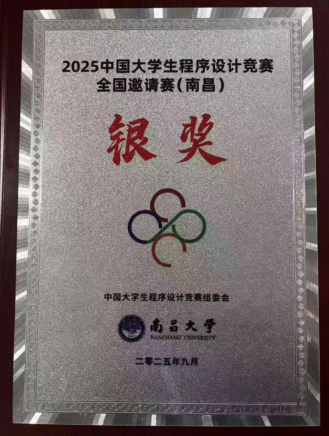 本网讯 9月13日,在2025中国大学生程序设计竞赛全国邀请赛(南昌站)中,我校学子杨拓丹凭借扎实的专业基础、顽强的拼搏精神和出色的现场表现,勇夺银牌,实现我校在该项全国高水平赛事中奖牌的“零的突破”,书写了学校学科竞赛新的历史篇章!