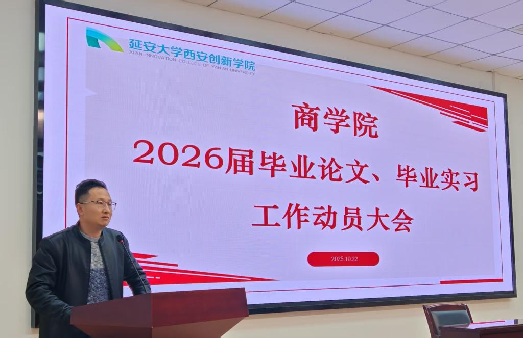 本网讯 为全面部署与推进2026届毕业生实习及毕业论文工作,确保各项任务高质量开展,10月22日下午,商学院在樊川大讲堂召开2026届毕业生实习暨毕业论文工作动员大会。商学院领导班子成员、毕业论文指导教师、实习指导教师、毕业班辅导员及2026届全体毕业生参加会议。会议由商学院副院长刘逗逗主持。