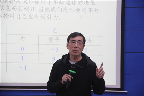 中国科学院数学与系统科学研究院研究员、中国运筹协会理事长胡晓东教授作题为《我们身边的博弈论》主题报告,他从一张100元拍卖的现场游戏入手,让大家了解什么是博弈,进而通过二战实例、最优混合策略、囚徒两难、财产划分与塔木德方案等案例生动得讲解博弈论在实际生活中的运用,整场报告不断穿插互动游戏,让一场专业的理论报告成为一场数学与艺术结合的盛宴。